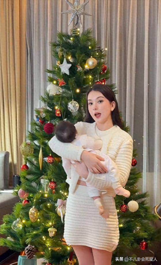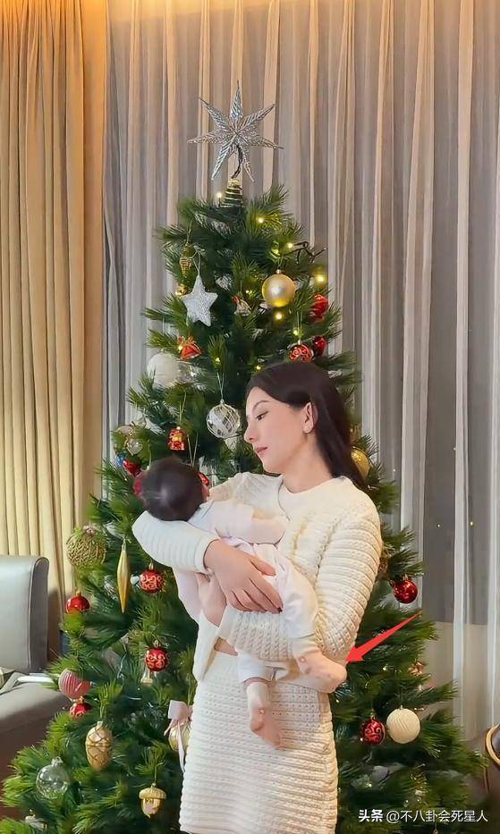 方媛站在家里的圣诞树前面,一身白色套装怀里抱着小宝宝,孩子穿的是一双粉色的袜子,从这点基本能断定出孩子的性别了。